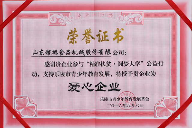 2016年8月6日,山東銀鶴食品機(jī)械股份有限公司參與“精準(zhǔn)扶貧 圓夢(mèng)大學(xué)”公益行動(dòng),支持樂(lè)陵市青少年教育發(fā)展,被授予“愛(ài)心企業(yè)”。
